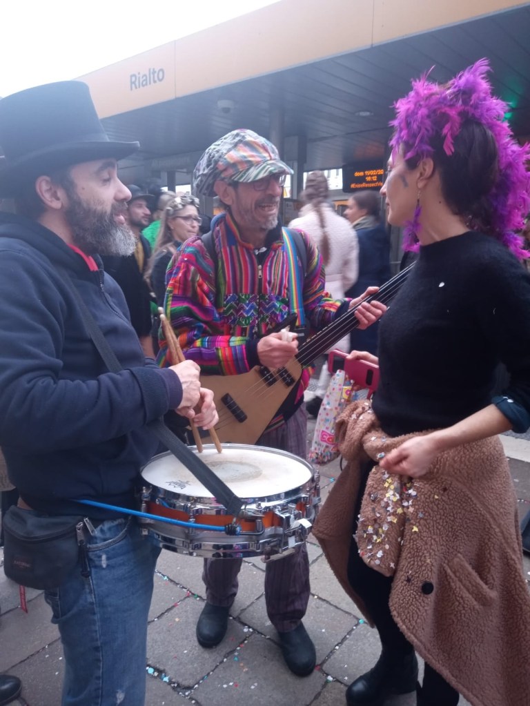 Il percorso è stato molto lungo, da S Geremia abbiamo camminato fino in campo Ss Apostoli, lì ci siamo fermati e siamo stati raggiunti da Dario al flauto traverso e da Emiliano con la Keytar e l’amplificatore portatile. Loro due e Francesco al basso elettrico hanno completato la parte armonica.